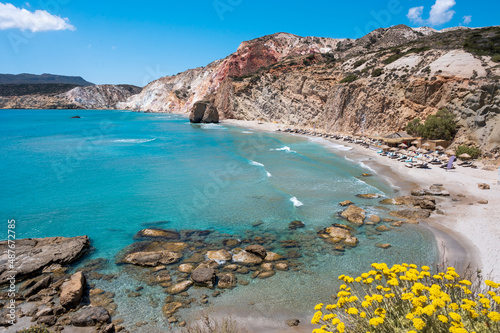Fyriplaka beach with rock formations and red cliffs - Firiplaka, Milos, Cyclades, Greece