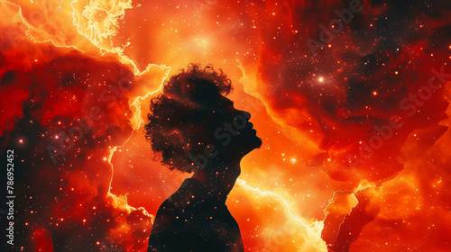 Galaxy, sky and silhouette of man in space for spiritual awakening, faith and mindfulness. Stars, astrology and abstract of person with thinking for universe, cosmic connection and prayer for hope