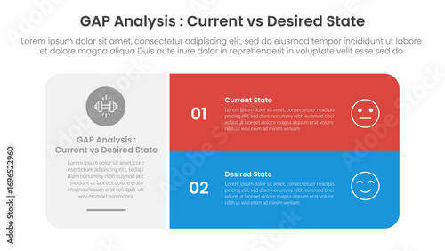 Gap analysis comparison concept for infographic template banner with big round box and stack list with two point list information
