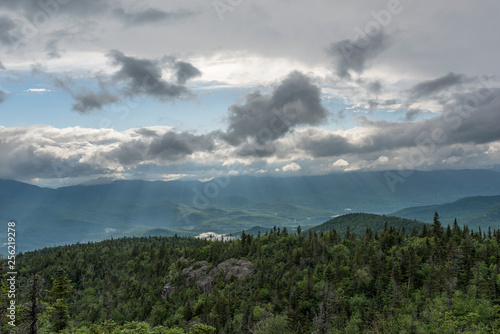 gaps in storm clouds allow sun rays to hit the lush valley floor