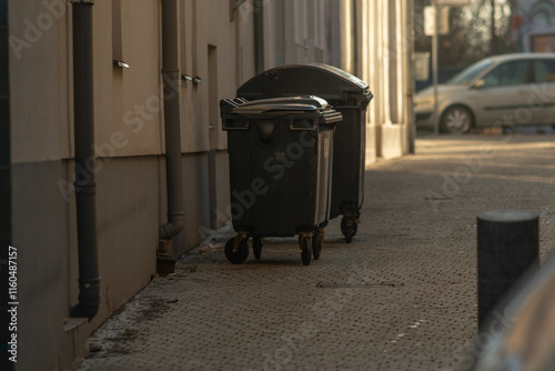 Garbage bins are placed on city streets, highlighting urban cleanliness and waste management efforts. Maintaining a tidy and organized urban environment.