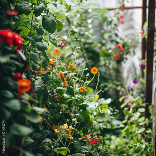 garden flowers greenery plants nature vibrant colorful red flowers orange flowers purple flowers lush foliage blossoming garden path sunlight outdoors
