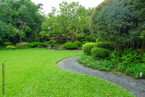 Garden landscape design with pathway in garden and footpath in picturesque summer park and staircase in backyard,Paving stones on floor in park,space for text.