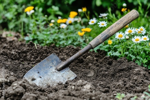 Gardening Tool Shovel in Soil Among Colorful Flowers Outdoors