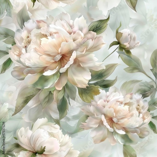 Garden-themed seamless background featuring lush peony blossoms and foliage in a soft watercolor style, creating a serene, natural garden ambiance