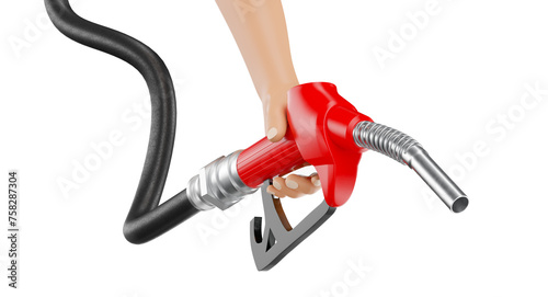 Gasoline pump nozzle in red with hand holding in realistic 3d render with transparent background
