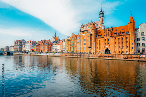 Gdansk with Motlawa river in Poland. Old town colourful house with Holy Spirit Gate