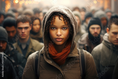 generated illustration of woman standing confidently in front of a large crowd. standing out from the crowd.