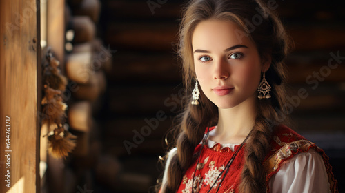 Generative AI, beautiful girl, young woman in traditional Slavic dress, Russian sundress, wooden village house, country life, portrait of a Russian girl, big eyes