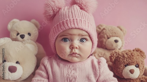 Generative AI illustration of serious baby girl in pink hat looking at camera while sitting among teddy bears against pink background