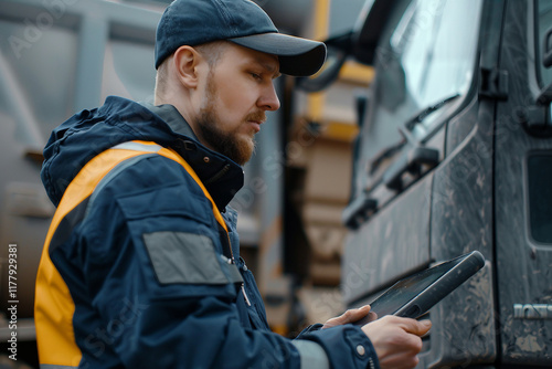 Generative AI image of long-haul truck driver male female large transport vehicle shipment