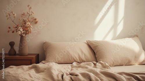 Generative AI, Relaxing bedroom detail of bed with natural linen textured bedding, muted neutral aesthetic colors