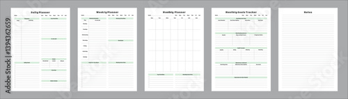 Generic Planning Pages and Planner Sheets Design Template for daily, weekly, and monthly organization for organizing daily routines and personal goals Set of 5 Pages