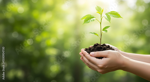 gentle hands cradling a delicate sprout, symbolizing new life and environmental stewardship, with vibrant green background