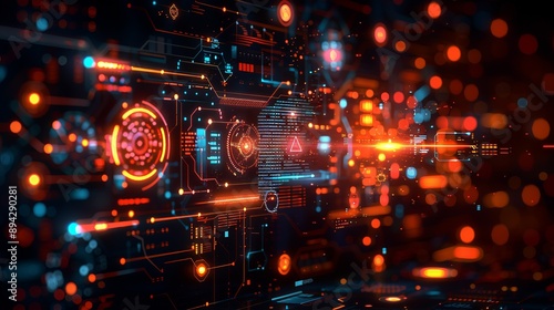 Geometric tech symbols and holographic elements in an abstract design showcasing the integration of industrial science. , Minimalism,