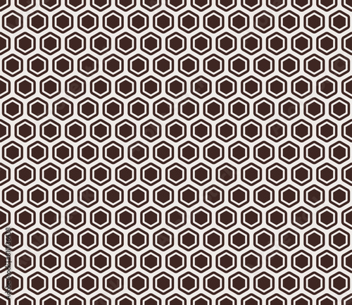 Geometric template background. Dark brown color on matching background. Bold rounded hexagon cells with padding and inner solid cells. Seamless pattern. Tileable vector illustration.