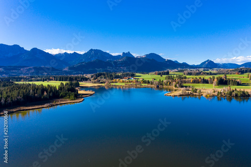 Germany, Bavaria, East Allgaeu, Fuessen region, Hopfen am See, Aerial view of Hopfensee