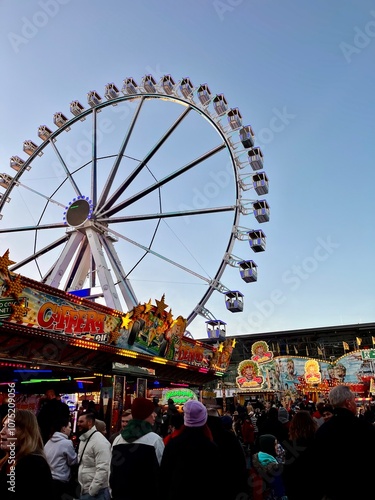 Germany,Bremen. 03.11.2024. Part of high, glowing ferris wheel in the evening.