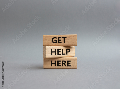 Get help here symbol. Wooden blocks with words Get help here. Beautiful grey background. Business and Get help here concept. Copy space.