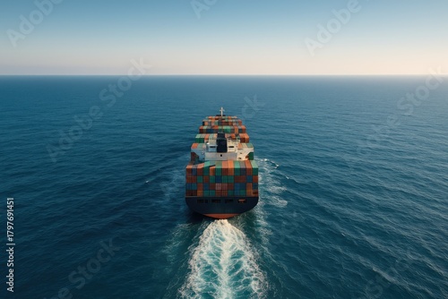 Giant cargo ship sails across vast ocean leaving white wake behind it, maritime transport and logistics