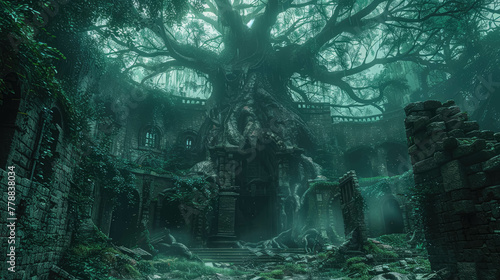Giant World Tree In Old Ruins Medieval Fantasy Landscape Background