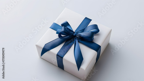 Gift box with blue ribbon on clean background, elegant holiday present