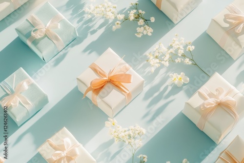 Gift Boxes With Colorful Ribbons and Flowers on a Pastel Blue Surface in Bright Natural Light