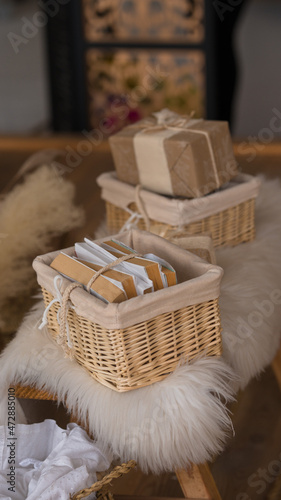 Gifts in craft paper. Gift wrapping idea. Gift in the basket