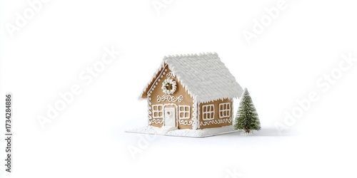 Gingerbread House with Snow Covered Roof and Small Christmas Tree on White Background