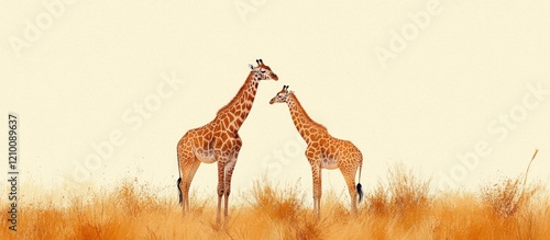 Giraffes interacting savanna grassland, calm background, wildlife poster