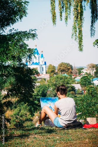 Girl artist in spruce green park draws oil-based paints