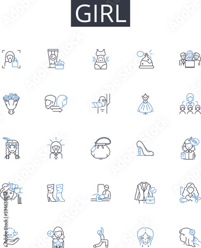 Girl line icons collection. Female, Woman, Lady, Miss, Maiden, Young woman, Teenager vector and linear illustration. Daughter,Sister,Niece outline signs set