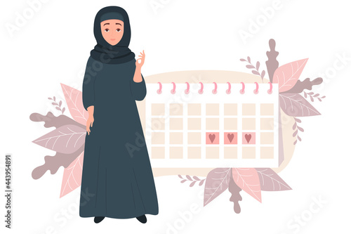 girl looking at calendar. Beautiful Muslim woman wearing hijab. Stands near the female health and menstruation calendar on a decorative background. Vector illustration. Womens health concept