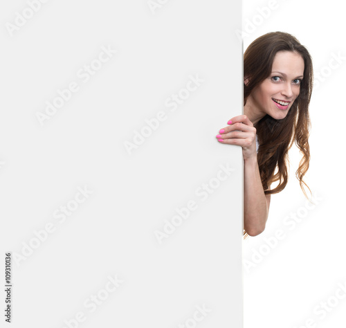 girl looks out from behind a banner