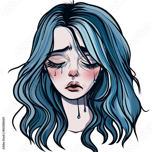 girl with blue hair and sad facial expression . Clipart PNG image . Transparent background . Cartoon vector style