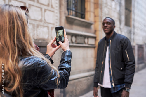 Girlfriend making photograph of her boyfriend in the street.