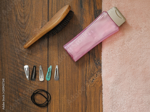 Girl's hair care items on a wooden table. Bottle of shampoo, brush, elastic bands, metal clips, pink towel.