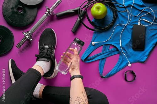 Girls legs wearing black trainers sitting on a mat surrounded by mobile phone, earphones, towel and a shaker in the fitness club. Top view.