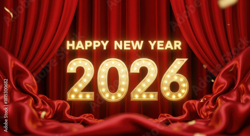 Glamorous 2026 happy new year celebration with red velvet curtains