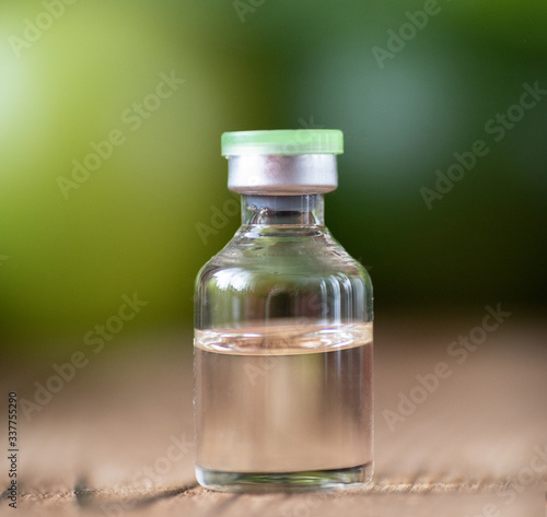Glass ampule medicine wooden table background