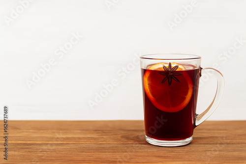 Glass cup of mulled wine with orange slice and star anise on wooden table. Minimalist composition with white background and copy space. Winter drink concept.