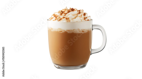 Glass mug of pumpkin spice latte topped with whipped cream and cinnamon powder, isolated on transparent background