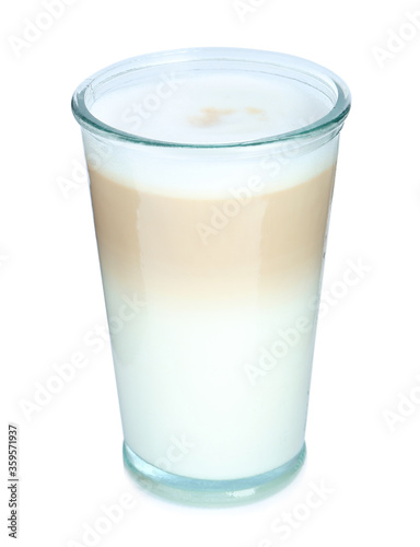 Glass of delicious latte macchiato isolated on white