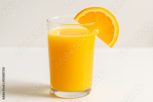Glass of orange juice with orange slice on white background
