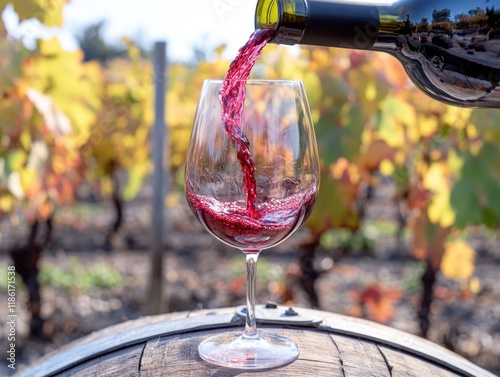 Glass of red wine is poured into a wine glass. The wine is poured from a bottle with a label that says "Merlot"