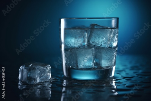 Glass of whiskey with ice cubes on dark blue background, closeup, generative Ai
