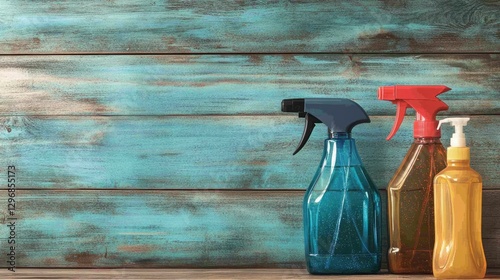 Glass spray bottles with homemade natural cleaning solutions on a wooden-textured background.