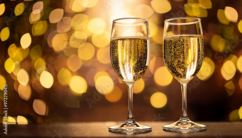 Glasses of champagne with golden bokeh on background. Alcoholic drink. Tasty festive beverage.