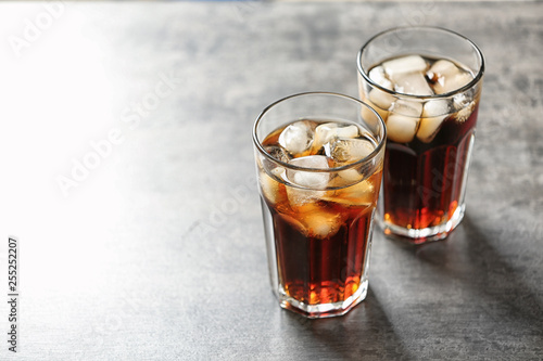 Glasses of cola with ice on grey background, space for text