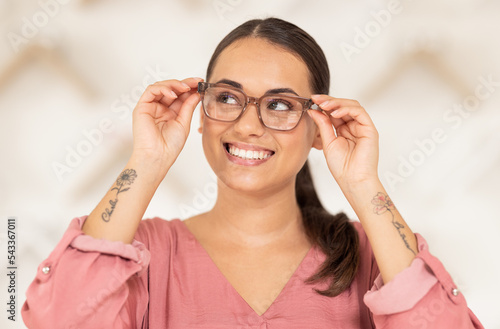 Glasses, vision and eyes with a woman customer at the optometrist to select a pair of prescription lenses. Retail, frame and thinking with a young female consumer buying eyewear in an optometry store